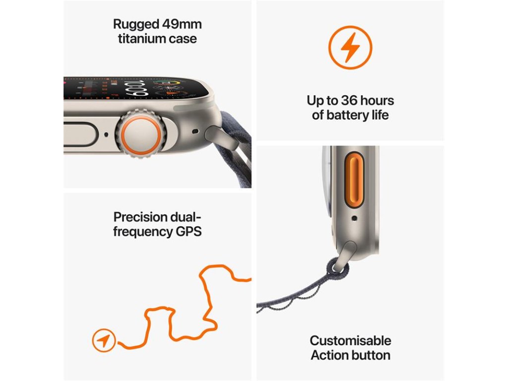 Apple Watch Ultra 2. Dobrodružství další úrovně. Nejodolnější a nejschopnější Apple Watch. Navrženo pro outdoorová dobrodružství a nabité tréninky s lehkým titanovým pouzdrem, extra dlouhou výdrží baterie a nejjasnějším displejem. Obsahuje dvojí klepnutí, magický způsob interakce s hodinkami Apple Watch a funkci Precision Finding, která vás dovede k vašemu iPhone. PROČ APPLE WATCH ULTRA 2 - Odolné, schopné a vyrobené tak, aby splňovaly požadavky vytrvalostních sportovců, outdoorových dobrodruhů a nadšenců vodních sportů - se speciálním řemínkem pro každého. S9 SiP umožňuje mimořádně jasný displej a magický nový způsob rychlé a jednoduché interakce s hodinkami AppleWatch, aniž byste se dotkli displeje. Výdrž baterie až 36 hodin a 72 hodin v režimu nízké spotřeby. UHLÍKOVĚ NEUTRÁLNÍ - Apple Watch Ultra 2 spárované s nejnovějšími Alpine Loop nebo Trail Loop jsou uhlíkově neutrální. EXTRÉMNĚ ODOLNÉ, NEUVĚŘITELNĚ SCHOPNÉ - 49 mm titanové pouzdro odolné vůči korozi. Velká korunka Digital Crown a přizpůsobitelné tlačítko Action pro okamžité ovládání různých funkcí. Vodotěsnost 100m. DOTŘEZ NEJVĚTŠÍ, NEJJASNĚJŠÍ DISPLEJ - Nejjasnější Always-On Retina displej od Apple je dobře viditelný i na ostrém slunečním světle. Více prostoru pro přidávání komplikací pro přizpůsobení ciferníku a dostatek místa pro zobrazení šesti metrik najednou. SVOBODA CELULAR - Mobilní komunikace je zabudována. Můžete volat a SMSkovat bez vašeho iPhone, dokonce iv zámoří s mezinárodním roamingem. Streamujte svou oblíbenou hudbu a podcasty. Získejte trasu pomocí map. PRO SPORTOVCE - Rozšířené metriky a zobrazení v aplikaci Cvičení včetně zón srdeční frekvence, vlastních tréninků a nových zobrazení cyklistického tréninku. Přesné dvoufrekvenční GPS poskytuje neuvěřitelnou přesnost pro výpočet vzdálenosti, tempa a map tras. Trail Loop je tenký, lehký a flexibilní, určený pro všechny typy tréninku. PRO VNĚJŠÍ DOBRODRUŽSTY - aplikace Compass poskytuje užitečné pohledy a podrobnosti, jako je nadmořská výška, sklon, zeměpisná délka a šířka. Podívejte se na poslední místo, kde jste měli mobilní příjem. Označte svou polohu pomocí trasových bodů kompasu. Backtrack využívá GPS k mapování, kde jste byli, abyste mohli sledovat své kroky. Alpine Loop je robustní a bezpečný, aby vyhovoval potřebám všech outdoorových dobrodruhů. PRO NADŠENCE VODNÍCH SPORTŮ-Vyrobeno pro rekreační vodní sporty, potápění a freediving pro sestupy do 40 metrů. Aplikace Depth zobrazuje čas, aktuální hloubku, teplotu vody, trvání pod vodou a maximální hloubku, které jste dosáhli. Aplikace Oceanic+ vám dá na zápěstí potápěčský počítač. Ocean Band je lehký a flexibilní, s titanovou přezkou a nastavitelnou smyčkou pro bezpečné uchycení i při vysokorychlostních vodních sportech. Funkce se mohou změnit. POKROČILÉ FUNKCE ZDRAVÍ A BEZPEČNOSTI - Upozornění na zdraví srdce, aplikace Blood Oxygen a aplikace EKG vás informují a posílí, pokud jde o vaše zdraví. Detekce pádu a detekce havárie vás mohou spojit s pohotovostními službami v případě tvrdého pádu nebo vážné autonehody. Podržením tlačítka Action aktivujete sirénu, kterou lze slyšet až do vzdálenosti 600 stop od místa, kde jste byli, abyste mohli sledovat své kroky. Alpine Loop je robustní a bezpečný, aby vyhovoval potřebám všech outdoorových dobrodruhů.Doplňkové parametry