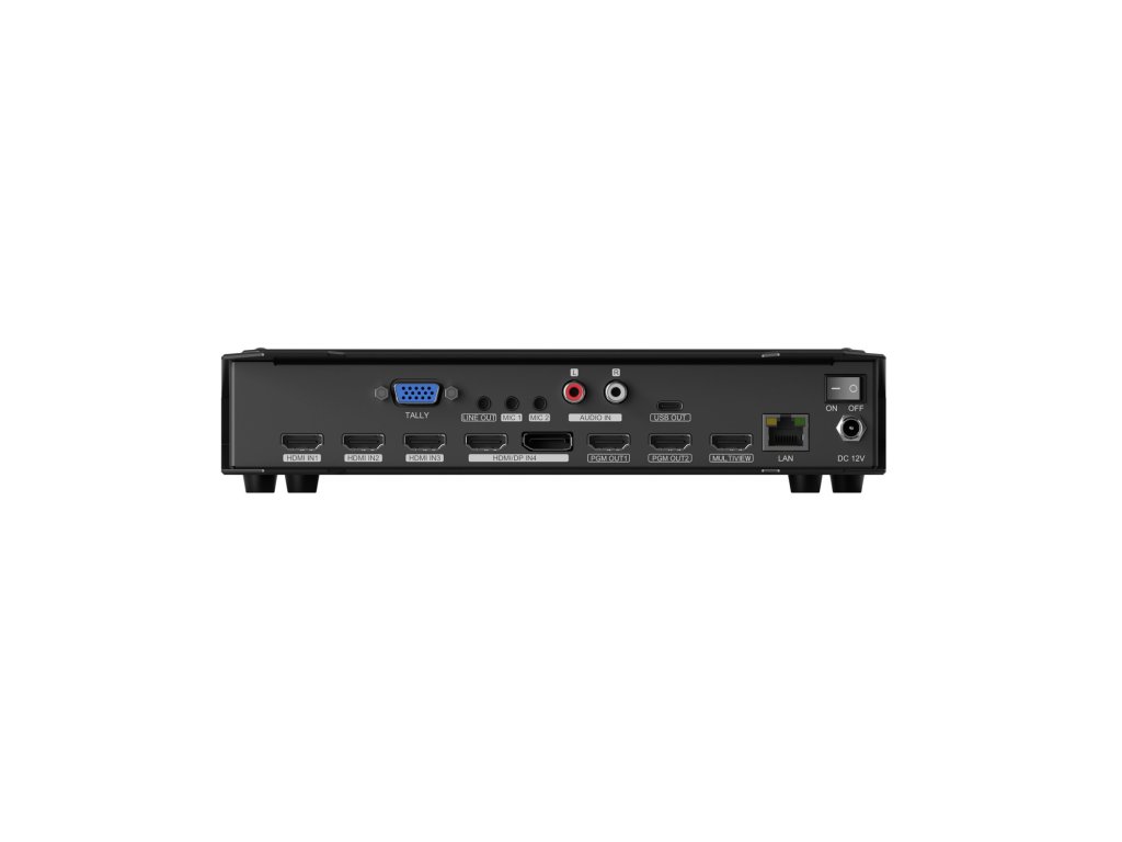 Více rozhraní zahrnuje vstupy HDMI a DisplayPort, programové výstupy, výstup pro vícenásobné zobrazení, audio vstupy, streamingové a nahrávací porty.