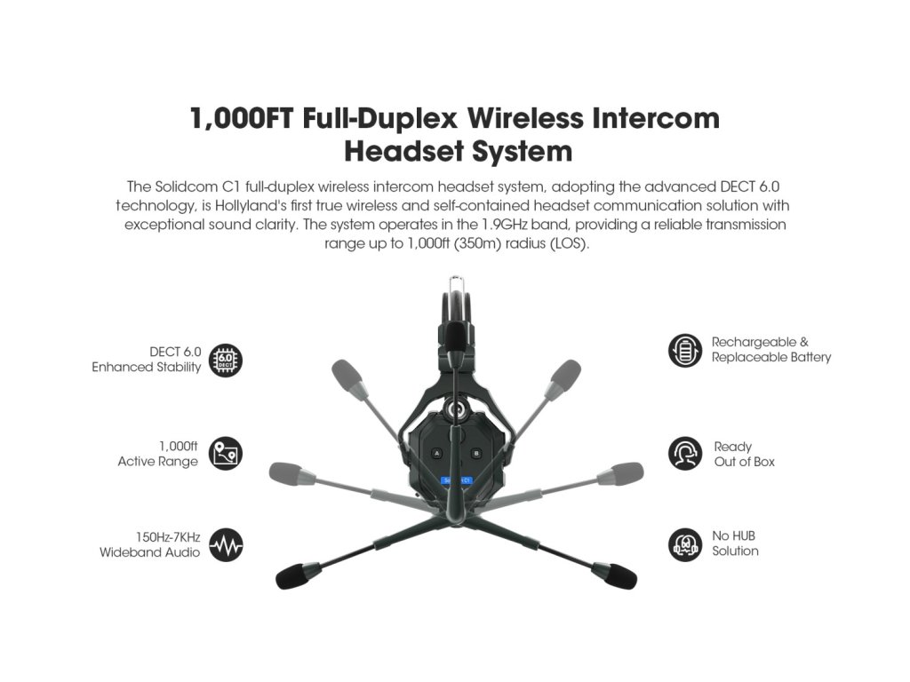 Solidcom C1-8S (bezdrátový interkomový systém s 8 náhlavními soupravami), využívající pokročilou technologii DECT 6.0, je prvním skutečným bezdrátovým a samostatným komunikačním řešením náhlavní soupravy společnosti Hollyland s výjimečnou čistotou zvuku. Systém pracuje v pásmu 1,9 GHz a poskytuje spolehlivý dosah přenosu až do poloměru 350 m (LOS). Bez opaskového balíčku nebo základní stanice nabízí vysoce přenosný a hands-free koordinační zážitek pro mediální produkční týmy nebo jakýkoli tým, který hledá neblokující hlasovou komunikaci v reálném čase v sociálně vzdálených pracovních scénářích.