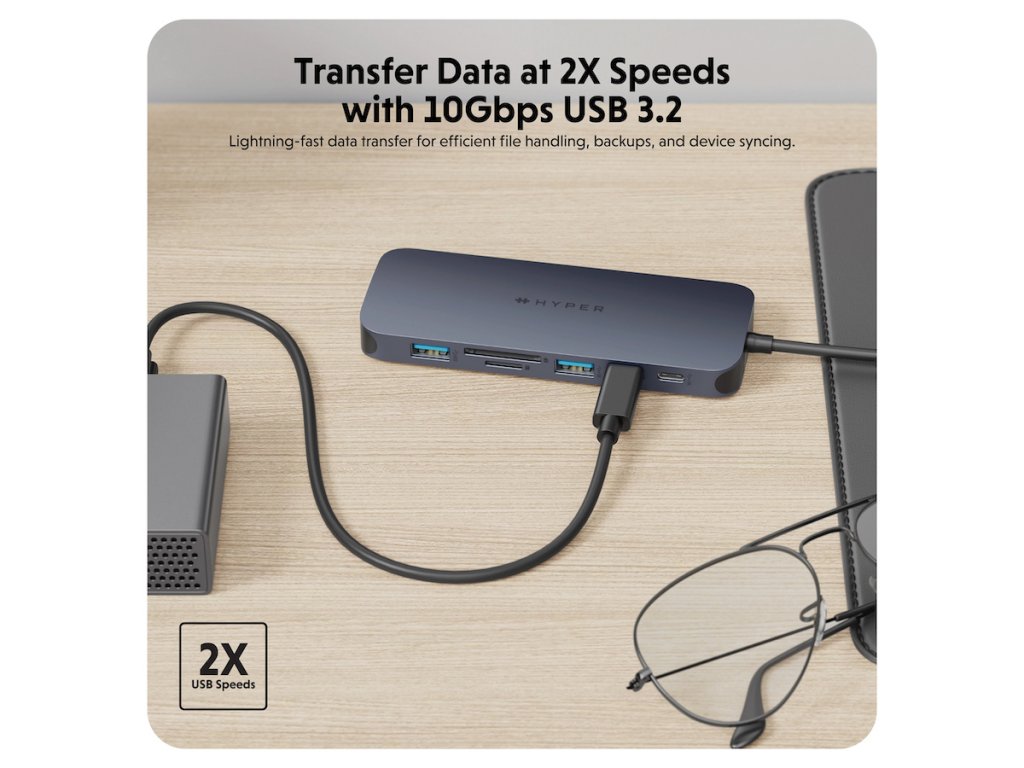 Hyper EcoSmart™ Gen.2 nabízí vše, co potřebujete pro plnohodnotnou práci na nejnovějším MacBooku Pro nebo Windows PC. Váš jediný boční port rozšíří až na 11 konektorů, kterým dominují hned dva USB-A porty, které umožňují průchozí napájení a plnou rychlost přenosu dat až 10Gbps a 5Gbps, nebo připojit rovnou dva externí monitory. Můžete tak současně dobíjet MacBook a zároveň připojit například 2 monitory. Mezi další výbavu patří 2x USB-C 10Gbps, microSD 312MB/s, SD312MB/s, Gigabit-Ethernet, 3.5mm Audio Jack Combo, USB-C Power Delivery 140W PD 3.1.Rozšířená podpora monitorů v rozlišení 4K 60 Hz pro počítače Mac, PC a Chromebook