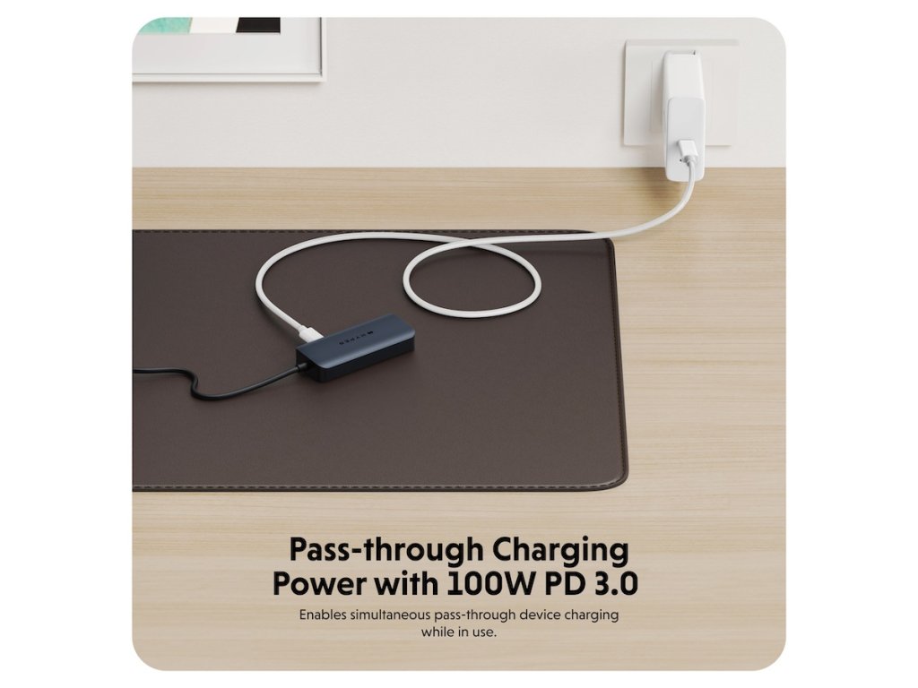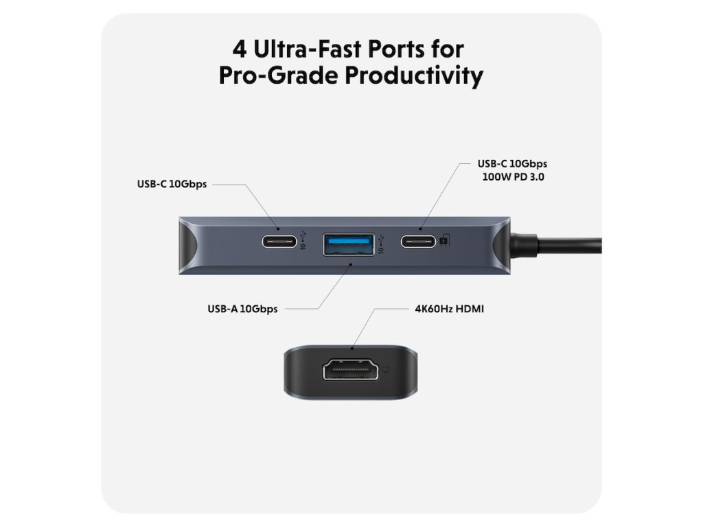 S tímto rozbočovačem zábava teprve začíná! Vychutnejte si díky němu křišťálově čistý obraz 4K 60Hz HDMI na kompatibilních 4K monitorech. Během práce, ale také například sledování filmů, můžete využít funkce paralelního a super rychlého nabíjení připojených USB-C zařízení. Umožňuje to technologie Power Delivery o výkonu až 100 W. A když už je řeč o rychlosti – hub podporuje přenos dat 10 Gb/s USB 3.2 přes porty USB-C i USB-A. Už vás tak nebude rozčilovat dlouhé čekání při práci s fotografiemi, videi nebo jinými soubory.Upozornění: Vysoké rozlišení 4K 60Hz vyžaduje přímé připojení HDMI k HDMI.