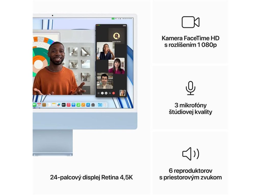 VYSPĚLÁ KAMERA A ZVUK – Kamera FaceTime HD s rozlišením 1080p, soustava tří mikrofonů studiové kvality a soustava šesti reproduktorů s prostorovým zvukem se postarají o to, že budeš skvěle vypadat i znít.