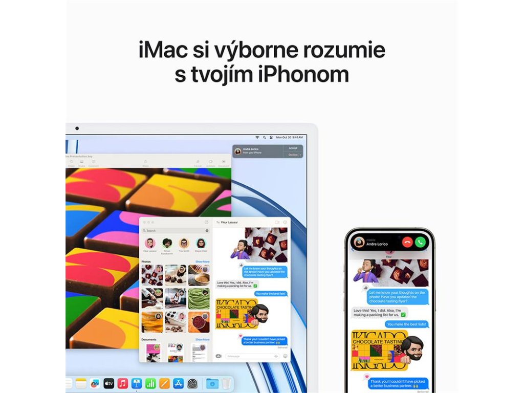 SPOLUPRACUJE SE VŠEMI TVOJÍMI ZAŘÍZENÍMI APPLE – Když zařízení Apple používáš společně, můžeš dělat úžasné věci. Zkopíruj něco na iPhone a vlož to na iMacu. Přijímej hovory přes FaceTime a posílej textové zprávy přes apku Zprávy přímo na iMacu. A to je jen začátek.