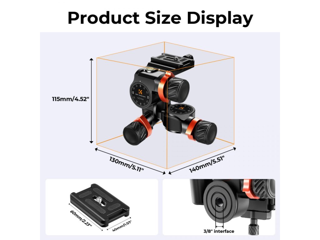 K&F Concept 3cestná ozubená hlava stativu s CNC procesem z hliníkové slitiny, vysoce...