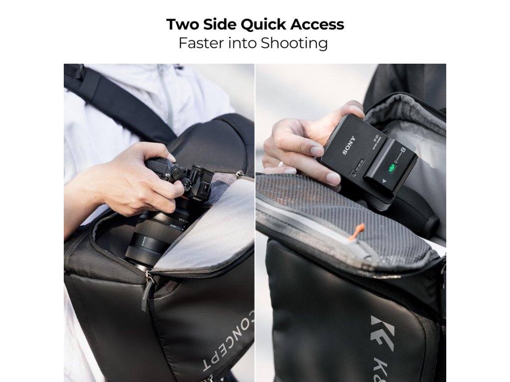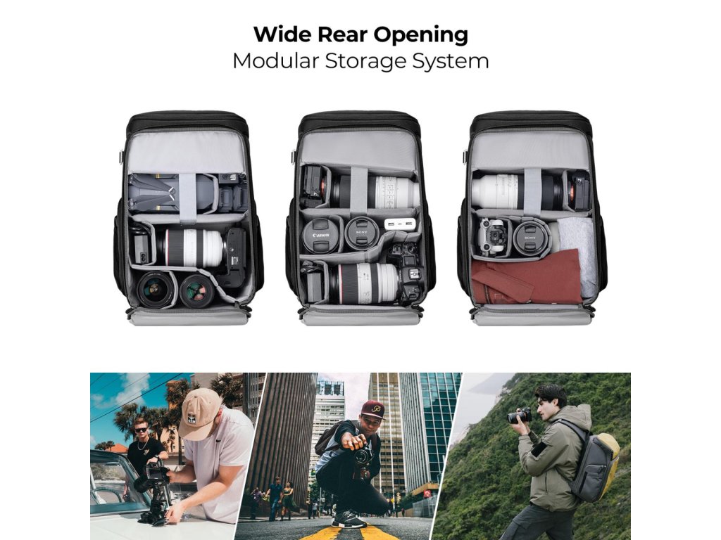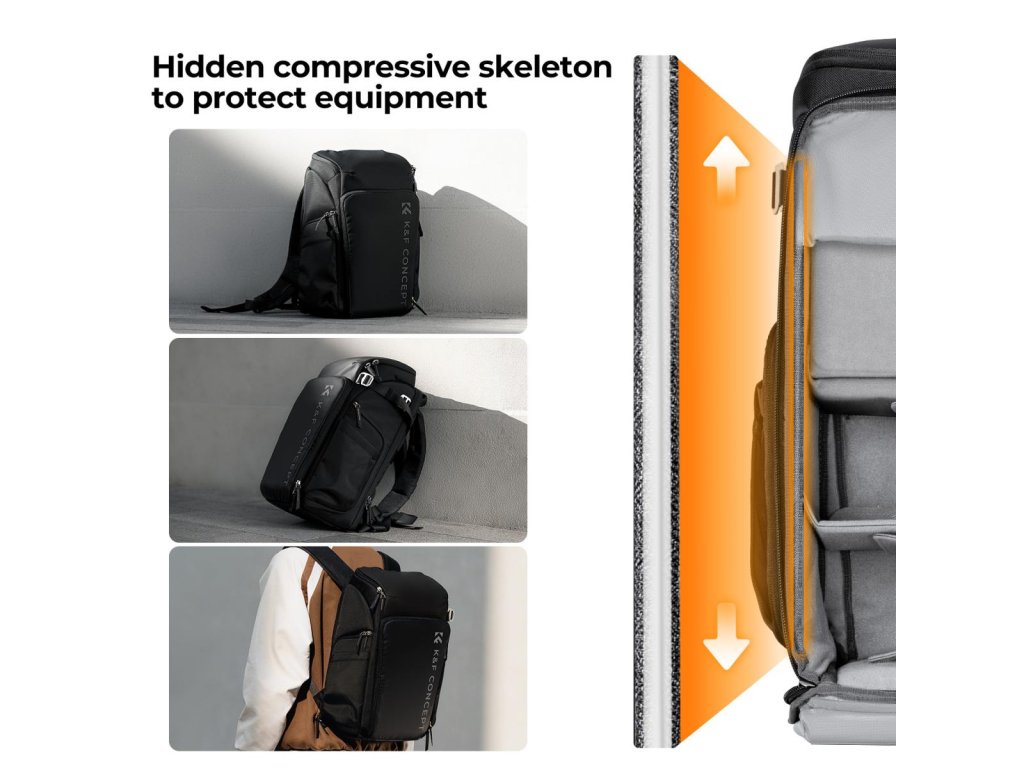 Fotografický batoh K&F Concept má všestranný design „Magic Bin Design“ pro nastavitelný prostor, díky čemuž je vhodný pro různé fotografické scénáře. Se stabilní vnitřní podporou, rozšířením kapacity, horním a bočním přístupem a zavěšenou přihrádkou na počítač zajišťuje bezpečnost a pohodlí pro fotografy, zejména ty, kteří se věnují fotografování venku a portrétů.