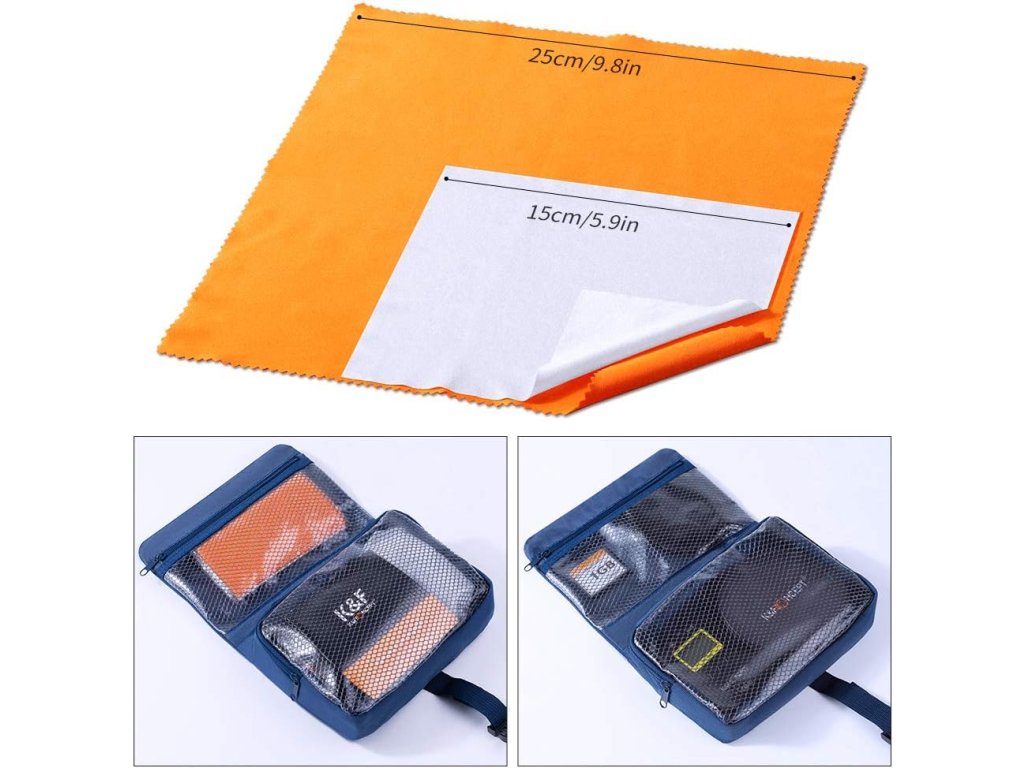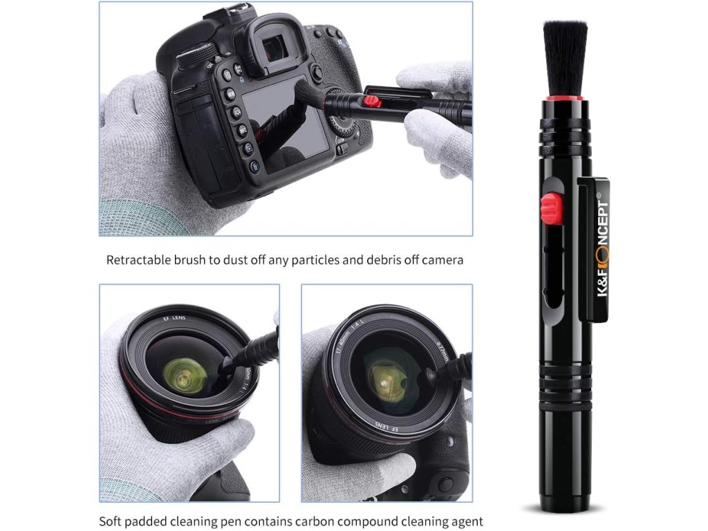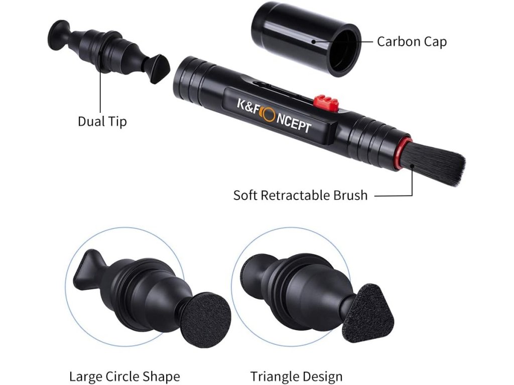Čistící hadříky z mikrovlákna + pero na čočky: Měkké štětiny, žádná statická elektřina, žádné poškození zařízení. Účinně čistěte velké částice prachu, abyste odstranili prach v trupu a štěrbinách; Čistící pero se zasouvacím měkkým kartáčkem na jednom konci a měkkou čistící podložkou na druhém konci k odstranění otisků prstů a šmouh.