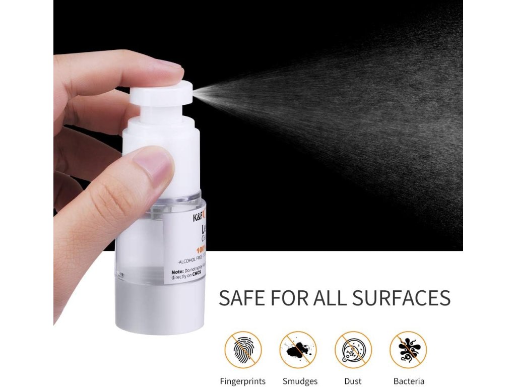 15 ml čistící kapalina + opakovaně použitelná rozprašovací láhev: Přijměte hlavu vakuové pumpy, která je účinná na čištění a údržbu optické čočky; Snadno odstraňte olejové skvrny, prach z otisků prstů a jiné nečistoty z objektivu.