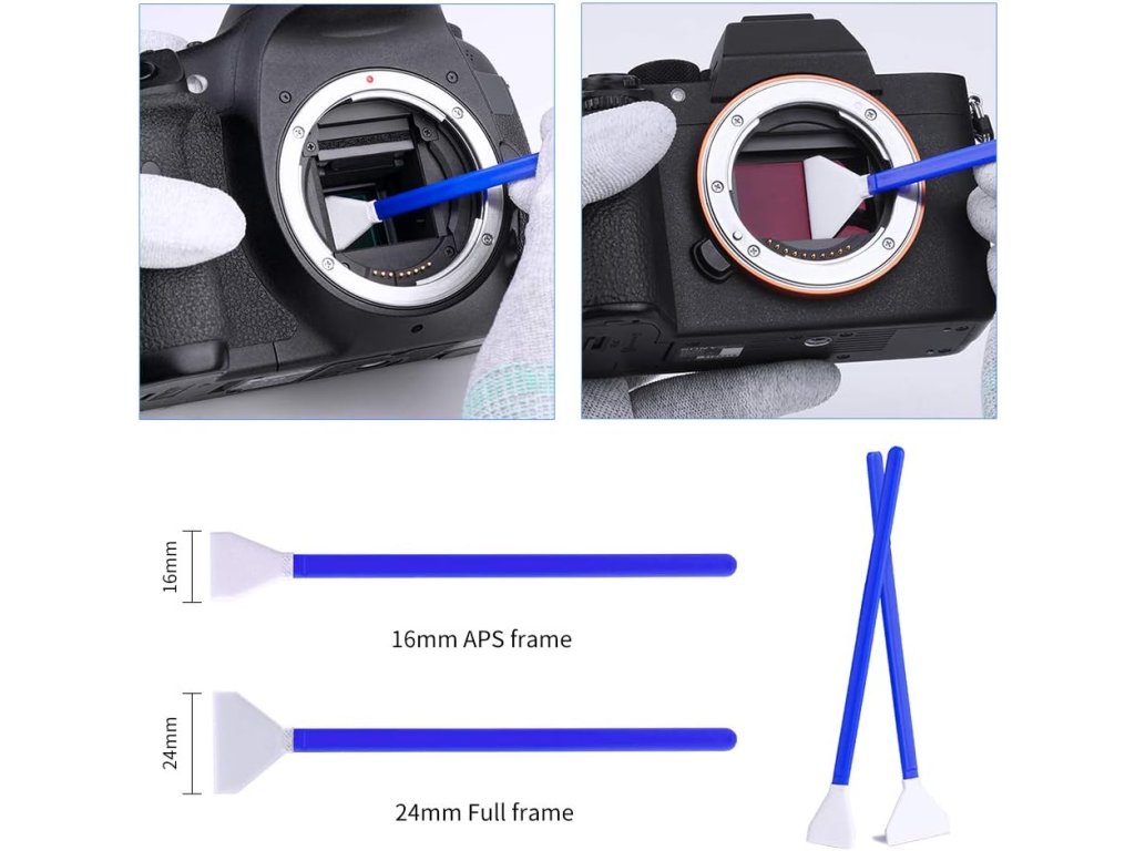 Tampony na čištění snímače pro 24 APS & 16 APS-C: Přizpůsobené podle velikosti rámového snímače, flexibilní uchycení umožňuje, aby se jazyk přizpůsobil snímači, aniž by jej poškodil, a účinně zabraňuje úlomkům.