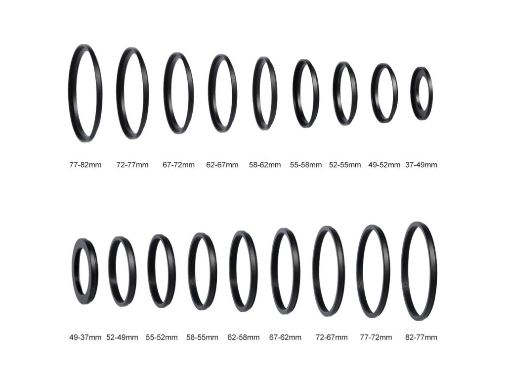 Kroužkový adaptér filtru objektivu 18 v 1 sada vše v jednom. Zahrnuje sadu kroužku adaptéru Step Up Filter (37-49, 49-52, 52-55, 55-58, 58-62, 62-67,67-72, 72-77, 77-82 mm). Zahrnuje sadu prstencového adaptéru filtru Step Down (49-37, 52-49, 58-55, 55-52, 62-58, 67-62,72-67, 77-72, 82-77 mm).