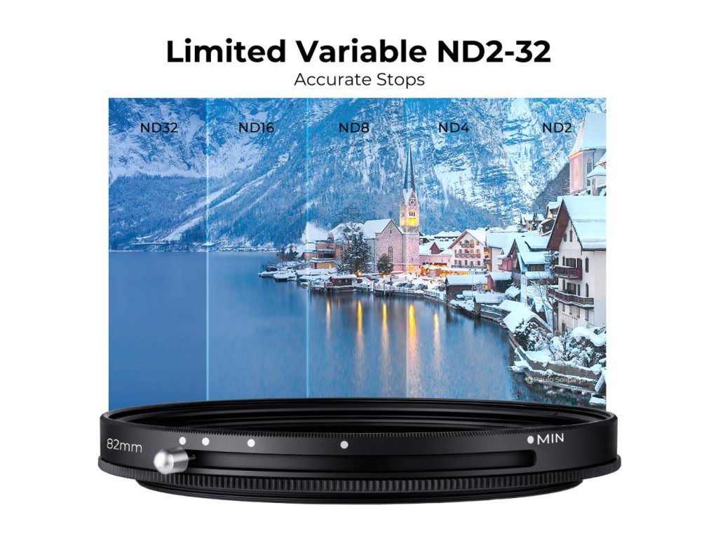* ?Rámy filtrů? Rámy filtrů vyrobené z hliníkové slitiny, zoubkovaný design okraje rámu usnadňuje instalaci. Na rámu je 5 značek od Min do ND32, je vhodné, abyste se ujistili, že se ND filtr zastaví.