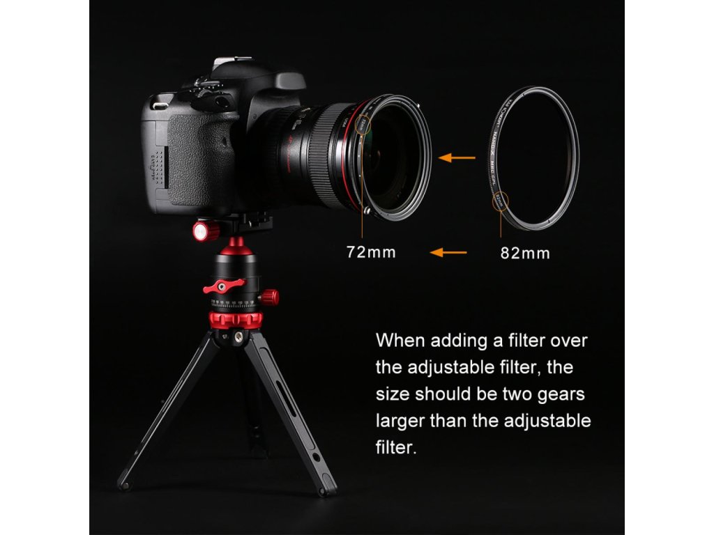 - * ?Rámy filtrů? Rámy filtrů vyrobené z hliníkové slitiny, zoubkovaný design okraje rámu usnadňuje instalaci. Na rámu je 5 značek od Min do ND32, je vhodné, abyste se ujistili, že se ND filtr zastaví.