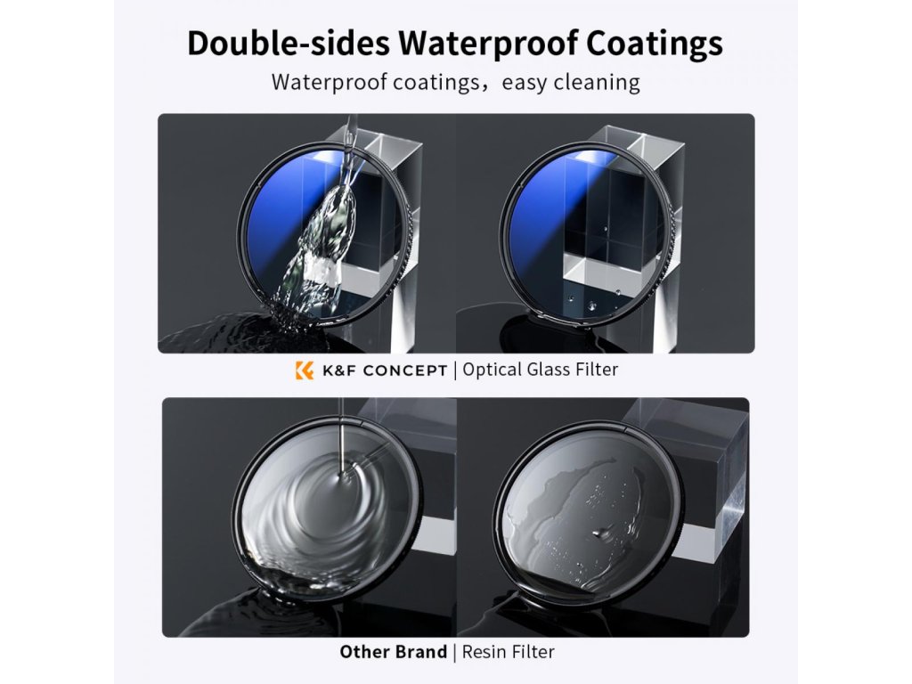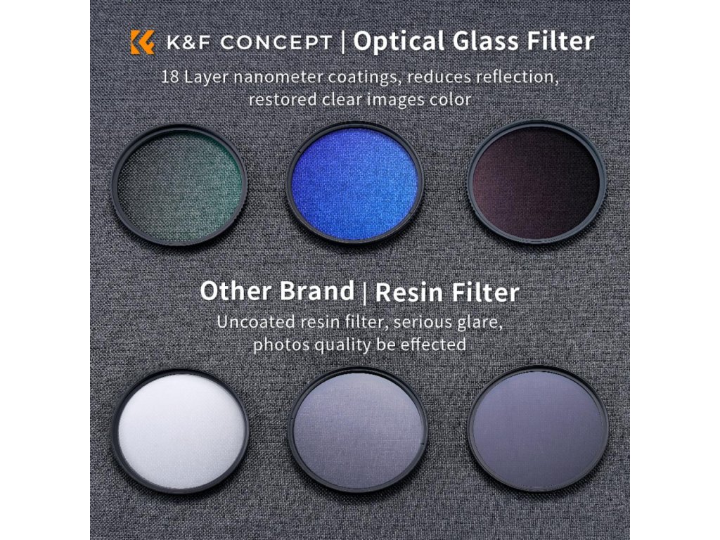 Sada optického skla pro profesionální fotografii objektivů K&F Concept obsahuje UV filtr + polarizační filtr CPL + filtr s neutrální hustotou (ND4) + sáček na filtry s hadříkem na čištění čoček.