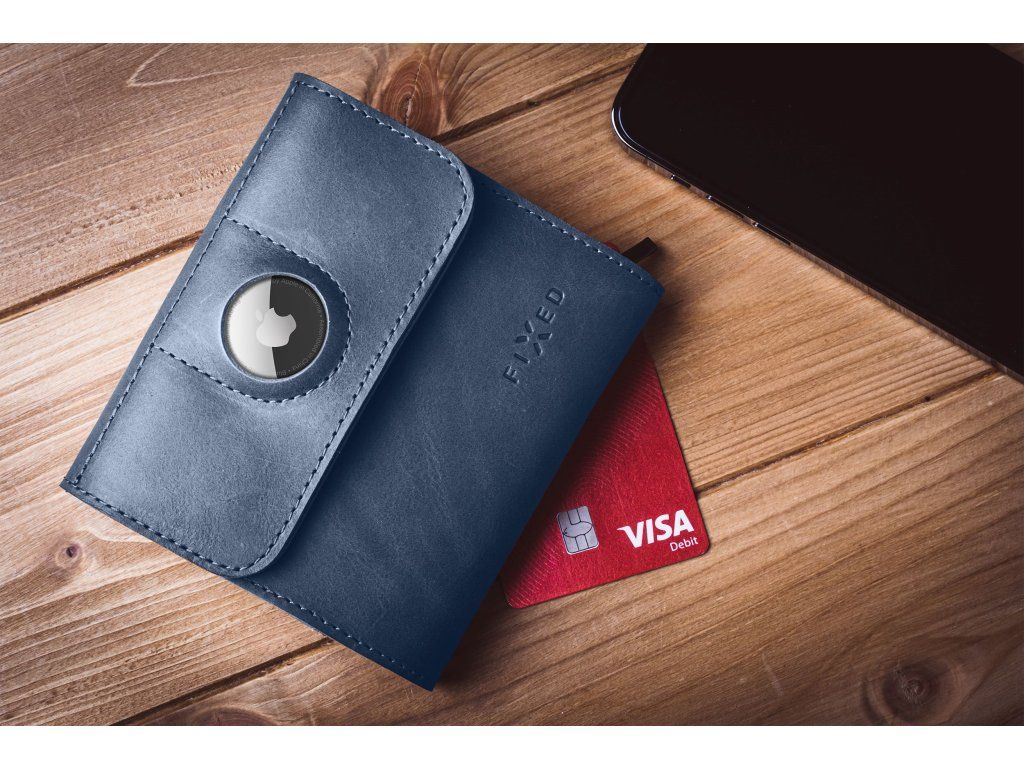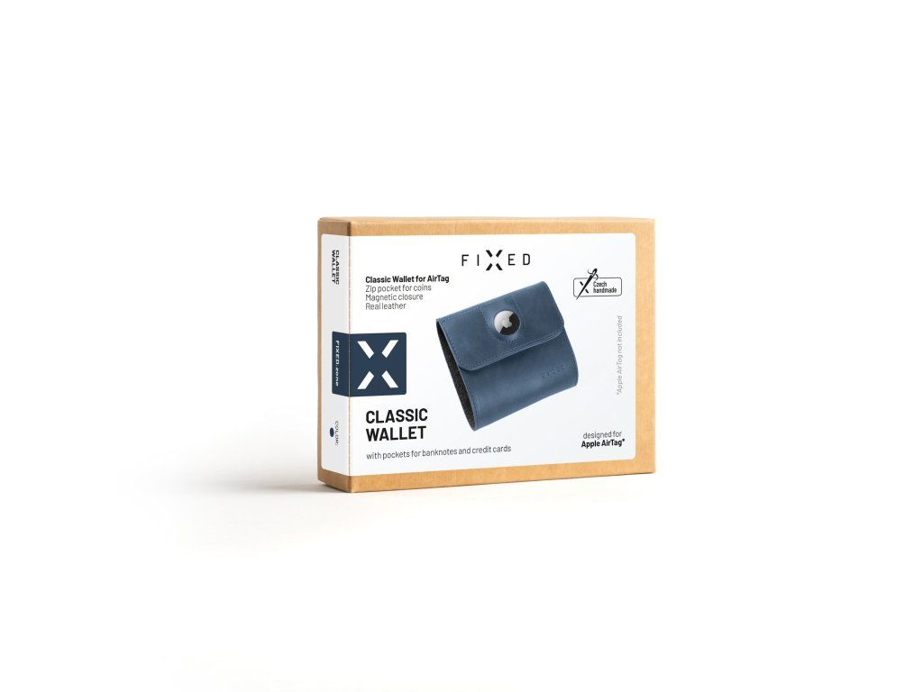 Kožená peněženka FIXED Classic Wallet for AirTag z pravé hovězí kůže, (modrá)