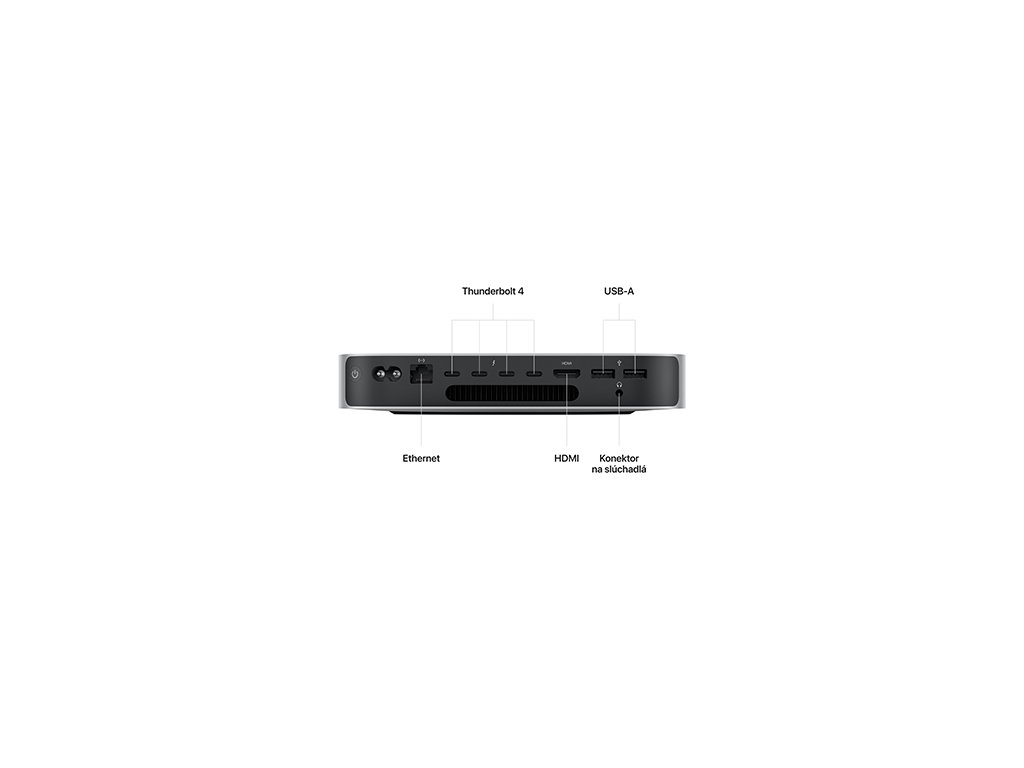 Mac mini s čipem M2 Pro disponuje čtyřmi porty Thunderbolt 4, dvěma porty USB-A, portem HDMI, Wi-Fi 6E, Bluetooth 5.3, gigabitovým Ethernetem a konektorem pro sluchátka. V případě potřeby rychlého síťového připojení můžeš mít Mac mini s 10 Gb Ethernetem, který má až 10krát vyšší propustnost.