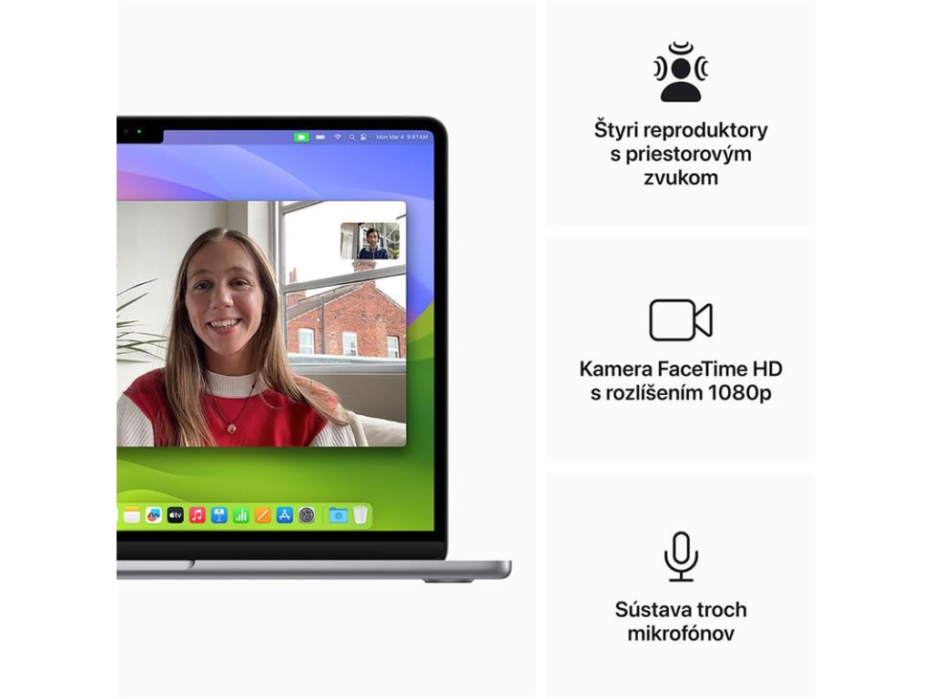 OSTRÝ OBRAZ I ZVUK – S kamerou FaceTime HD s rozlišením 1080p, třemi mikrofony a čtyřmi reproduktory, které podporují prostorový zvuk, vše vypadá a zní skvěle.