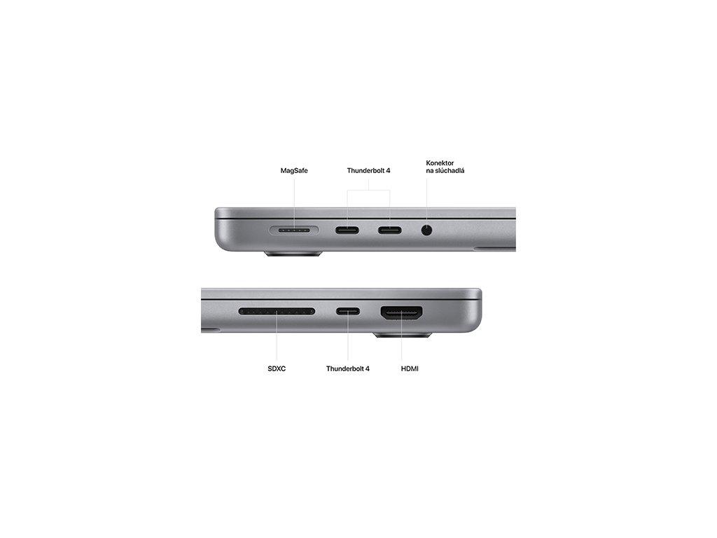 PŘIPOJ VŠECHNO, CO POTŘEBUJEŠ – MacBook Pro má nabíjecí port MagSafe, tři porty Thunderbolt 4, slot pro kartu SDXC, port HDMI a konektor pro sluchátka. A díky rozhraním Wi-Fi 6E a Bluetooth 5.3 si na něm můžeš užívat hladké bezdrátové připojení.