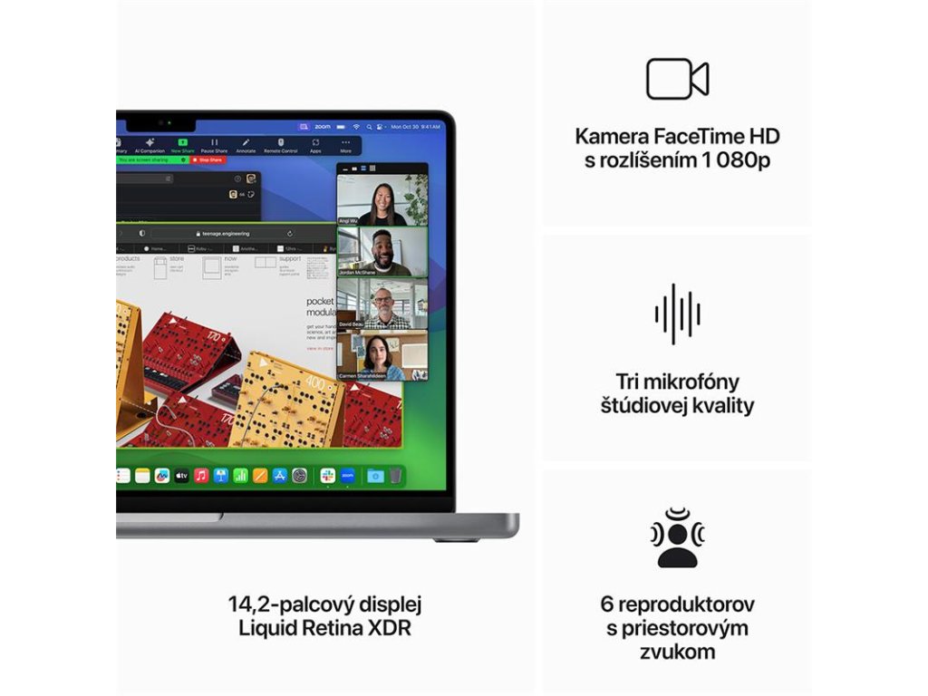 NÁDHERNÝ PROFESIONÁLNÍ DISPLEJ – 14,2palcový displej Liquid Retina XDR s extrémním dynamickým rozsahem při zobrazování HDR obsahu dosahuje trvalého jasu 1000 nýtů a SDR obsah zobrazuje s jasem až 600 nýtů. A protože podporuje profesionální referenční režimy, můžeš se i na cestách spolehnout na nejlepší výsledky.