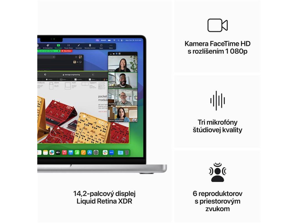 NÁDHERNÝ PROFESIONÁLNÍ DISPLEJ – 14,2palcový displej Liquid Retina XDR s extrémním dynamickým rozsahem při zobrazování HDR obsahu dosahuje trvalého jasu 1000 nýtů a SDR obsah zobrazuje s jasem až 600 nýtů. A protože podporuje profesionální referenční režimy, můžeš se i na cestách spolehnout na nejlepší výsledky.