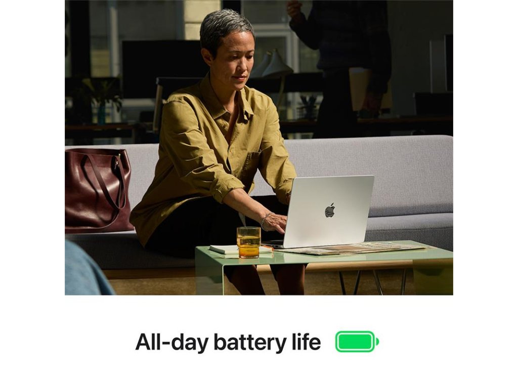 Baterie vydrží až 22 hodin, což znamená, že se můžeš spolehnout na to, že tě 14palcový MacBook Pro nezradí ani během dlouhého pracovního dne. Jeho výkon je stejně skvělý při používání ze sítě iz baterie.