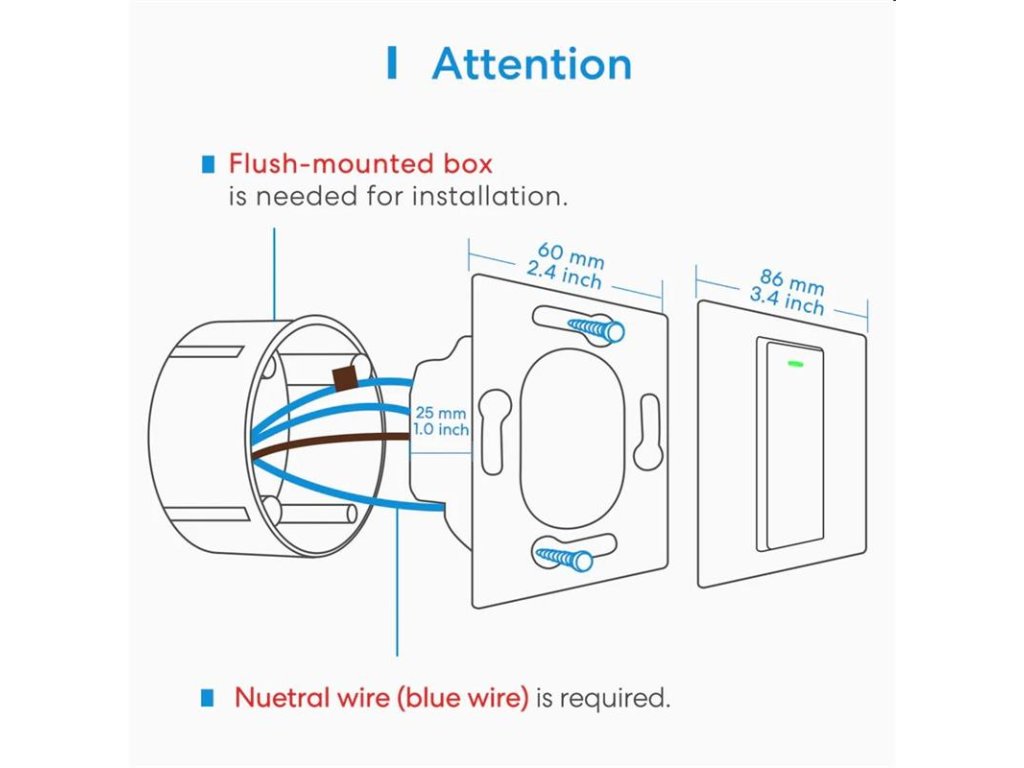 Vyžaduje se neutrální vodič: Před zakoupením se ujistěte, že vaše krabice pod omítku má neutrální vodič (v modré barvě). Pokud si nejste jisti, vyfoťte vnitřní část vaší krabice pod omítku a pošlete nám ji. Můžeme vám to včas zkontrolovat.