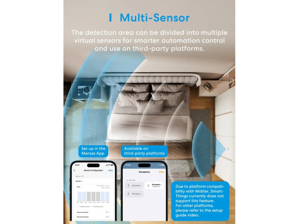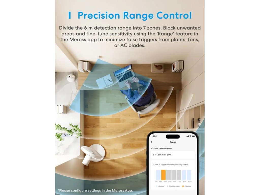 V aplikaci Meross si rozdělíte dosah na tři zóny a pro každou nastavíte vlastní podmínky přítomnosti/nepřítomnosti. Zóny se mohou v Matter platformách zobrazovat jako samostatné senzory – ideální pro vícestupňové smart osvětlení (hlavní světlo vs. stolní lampa) nebo koupelnové scény (noční světlo vs. zrcadlové).
