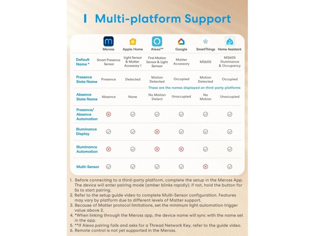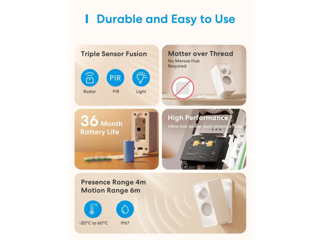 Meross MS605 je moderní bateriový snímač přítomnosti pro ekosystém Matter smart home. Díky Matter over Thread a pokročilému Nordic čipu přináší nízkou latenci a lokální ovládání, takže automatizace působí okamžitě – ideální pro chytré osvětlení, topení/klimatizaci a scény v Apple Home, Alexi, Google Home, SmartThings i Home Assistant.