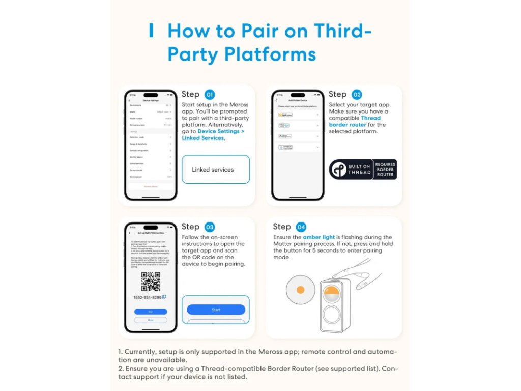 Párování a prvotní nastavení probíhá v Meross app přes Bluetooth v telefonu. Pro používání v platformách třetích stran není potřebný Meross Hub. Pro vzdálené ovládání a pokročilé funkce v Meross app (včetně vybraných automatizací) bude zapotřebí Meross Hub, který se vyvíjí a očekává se v Q2 2026.