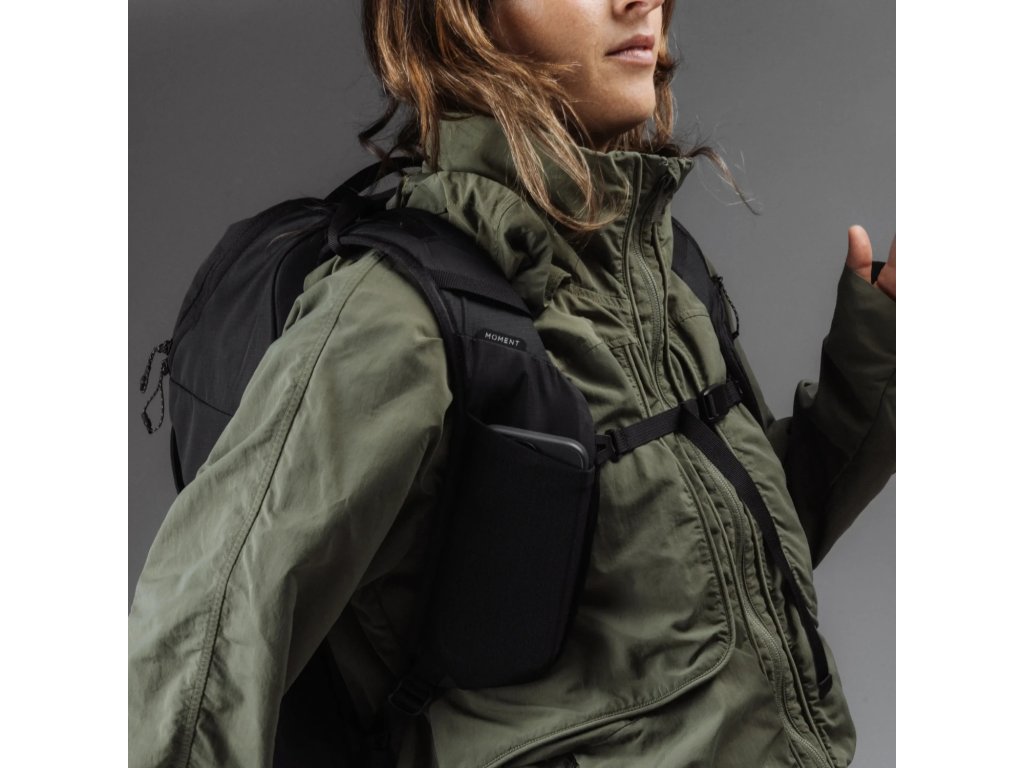 Ramenní popruhy inspirované vestou s elastickými kapsami na zip a integrovaným nabíjecím kanálem MagSafe pro rychlý přístup k fotoaparátu, filmu, telefonu, filtrům a občerstvení přímo na těle.
