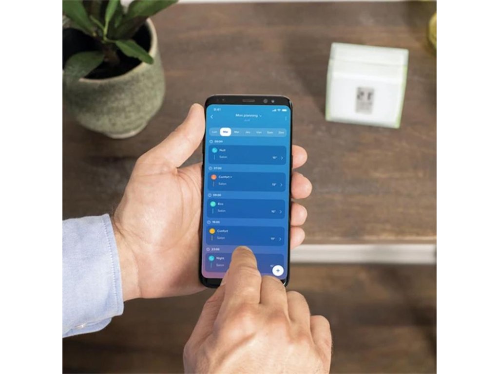 Šetříte náklady na vytápění s inteligentním termostatem. Tento programovatelný termostat vám umožňuje vytvořit inteligentní rozvrh, plán zapnutí/vypnutí a ovládat jej manuálně, dálkově, hlasem nebo přes SMS. S funkcemi Auto-Care a Auto-Adapt je váš dům v bezpečných rukou.