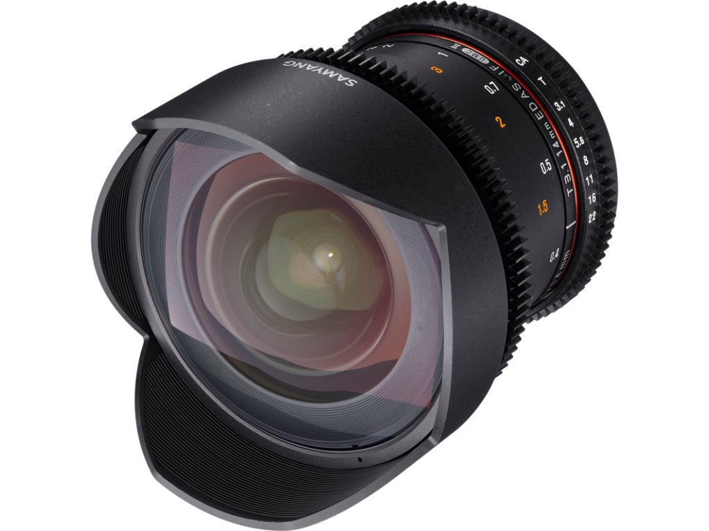 Objektiv Samyang 14mm T3.1 VDSLR ED AS IF UMC II je širokoúhlý manuální video objektiv navržený pro fotoaparáty s full frame snímačem. Byl vyvinut pro profesionální filmové potřeby a zaujme vysokou světelností a výtečnou kresbou.Samyang 14mm T3.1 VDSLR ED AS IF UMC II je pečlivě navržen pro vytváření profesionálních filmů a videí. Světelnost můžete změnit hladce a ticho pomocí odnímatelného clonového prstence. Stupnice vzdálenosti a "T" hodnoty jsou označeny na obou stranách objektivu pro snadnější manipulaci.