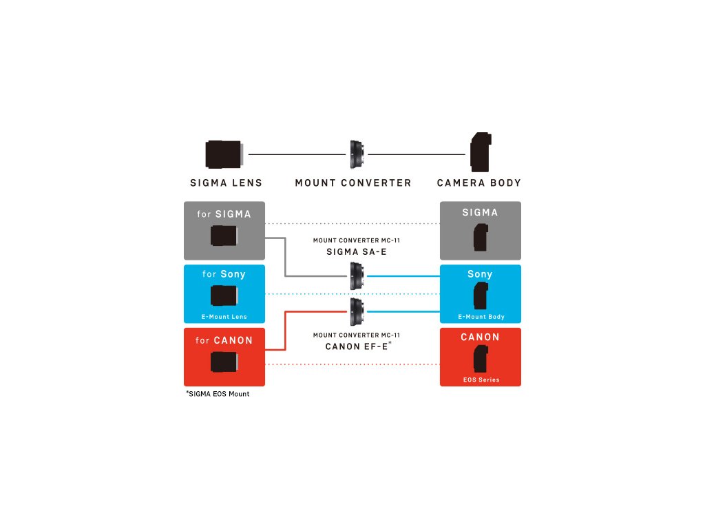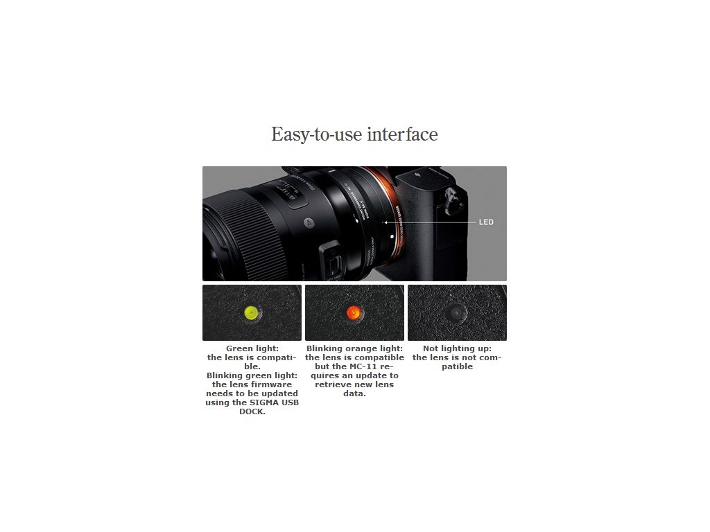 SIGMA MOUNT CONVERTER MC-11 je určen pro použití s fotoaparáty Sony E-mount (a7 series/NEX series/a5000/series a6000/a6300) a objektivy SIGMA EOS s bajonetem pro Canon EF-E. Informační LED dioda na konvertoru MC-11 (aktivuje se při zapnutí fotoaparátu): - zasvítí dlouho zeleně a zhasne - objektiv je kompatibilní a má aktuální firmware - zabliká zeleně a zhasne - objektiv je kompatibilní, ale vyžaduje aktualizaci firmwaru - zabliká oranžově - konvertor MC-11 vyžaduje aktualizaci firmwaru pomocí USB Docku - LED dioda nesvítí - objektiv není kompatibilní, možnost použití v manuálním módu* SEZNAM KOMPATIBILNÍCH OBJEKTIVŮ * SEZNAM KOMPATIBILNÍCH FOTOAPARÁTŮ