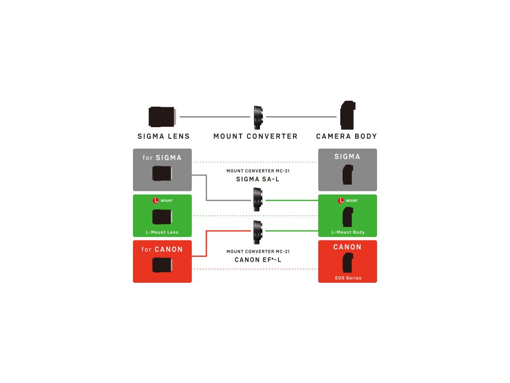 Mount convertor MC-21 značky SIGMA nabízí uživatelům možnost připojit objektivy s bajonetem SIGMA SA na fotoaparáty s bajonetem L-mount (Leica, Panasonic, Sigma). Informační LED dioda na konvertoru MC-21 (aktivuje se při zapnutí fotoaparátu): - zasvítí dlouho zeleně a zhasne - objektiv je kompatibilní a má aktuální firmware - zabliká zeleně a zhasne - objektiv je kompatibilní, ale vyžaduje aktualizaci firmwaru - zabliká oranžově - konvertor MC-11 vyžaduje aktualizaci firmwaru pomocí USB Docku - LED dioda nesvítí - objektiv není kompatibilní, možnost použití v manuálním módu* SEZNAM KOMPATIBILNÍCH OBJEKTIVŮ * SEZNAM KOMPATIBILNÍCH OBJEKTIVŮ