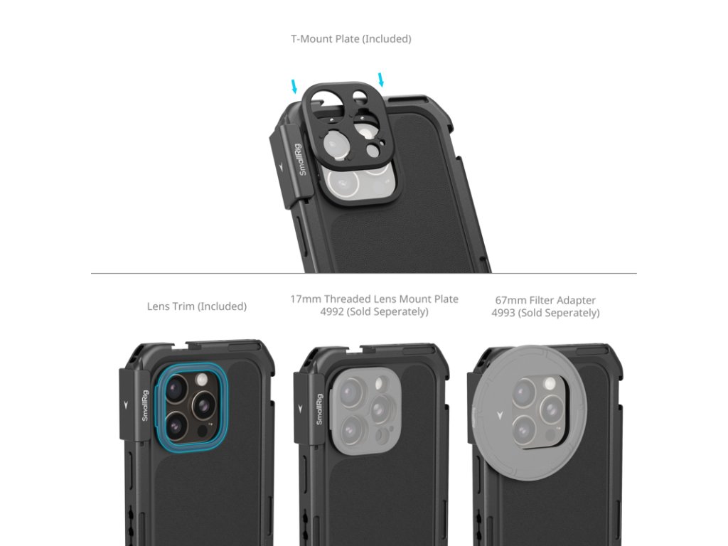 Vybavené pouzdro s rychloupínací zadní deskou T-mount slouží jako každodenní ochrana telefonu. Backplate T-mount lze přepínat pomocí ořezávacího krúžku, backplate objektivu se 17 mm závitem nebo 67 mm magnetického filtračního adaptéru pro zvýšení optického výkonu.Telefon lze rychle namontovat do klece, která je vybavena více otvory se závitem 1/4"-20 proti zkroucení a úchyty cold shoe pro rozšíření o příslušenství, jako jsou rukojeti, stativy, mikrofony a světla, čímž se zvýší váš zážitek z fotografování, zatímco integrovaná rozhraní s rychlou.