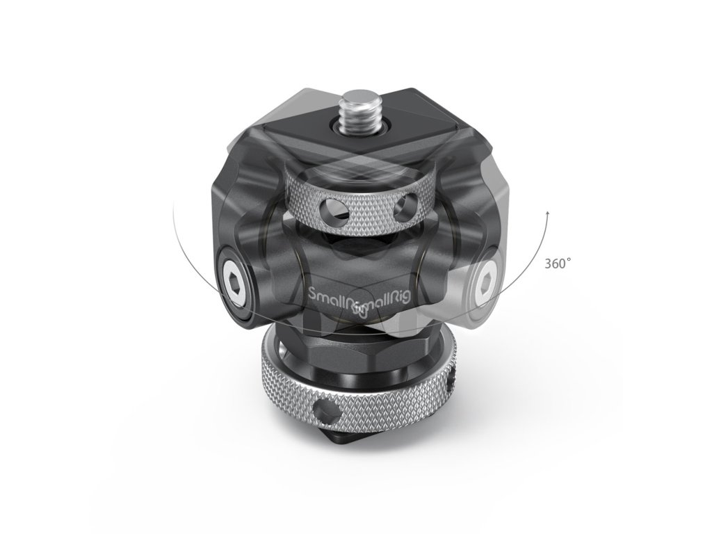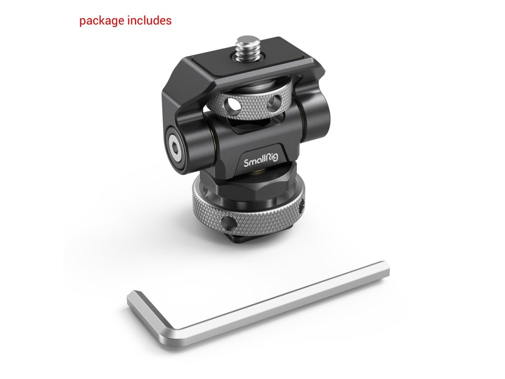 Otočný a sklopný držák na monitor SmallRig s cold-shoe mountem. Je vybaven 1/4 ”-20 šroubem na vrchní straně pro monitor, světlo nebo mikrofon. Držák umožňuje otočení o 360° do stran a naklopení o 170° s volným dorazem v libovolné poloze. Těsnost každé osy je nastavitelná pomocí imbusového klíče. Robustní držák je vyroben z hliníku obráběného CNC a může podporovat 5” a 7” monitor do hmotnosti 1,5 kg. Otočný a sklopný držák má na vrchu ochranné gumové polstrování a obsahuje imbusový klíč pro utažení úchytek pro další bezpečnost.