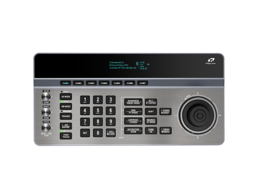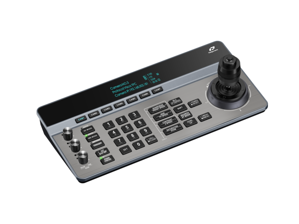 Vestavěný 3,12palcový OLED displej poskytuje jasnou zpětnou vazbu o stavu kamery a nastaveních ovládání v reálném čase. Ergonomické rozložení odděluje numerické a funkční ovládací prvky pro intuitivní ovládání, zatímco klávesové zkratky umožňují rychlé přepínání mezi kamerami. Možnosti připojení zahrnují Ethernet s podporou PoE, rozhraní RS232, RS422 a RS485, což zajišťuje kompatibilitu se širokou škálou profesionálních PTZ kamer.