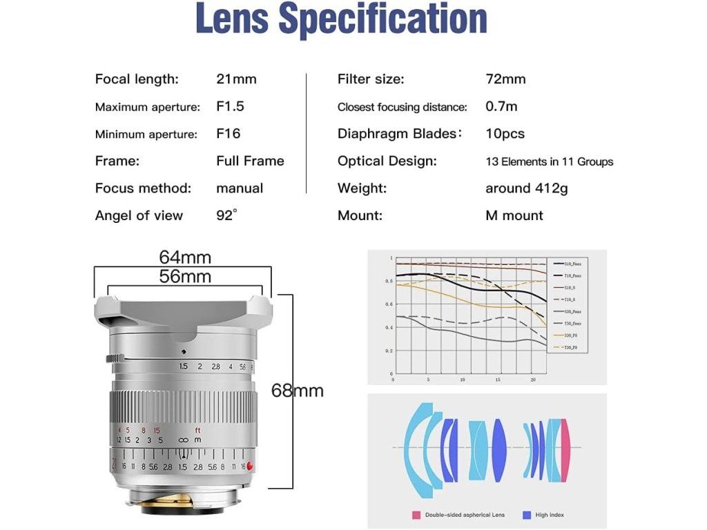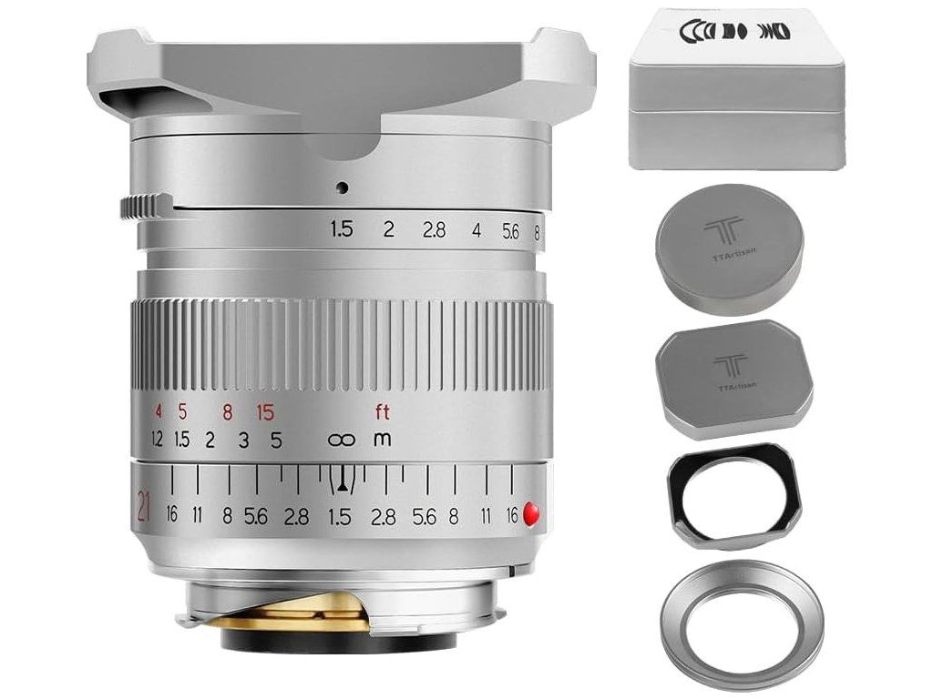 Objektiv TTArtisan 21 mm F1,5 je jeden z nejmenších a nejlehčích full-frame širokoúhlých objektivů. Jeho celokovové tělo s 13 prvky v 11 skupinách a 10 lamelami clony váží 422 – 458 g. Součástí balení je sluneční clona s tvarem tulipánového květu a kulatý držák filtrů (velikost filtru: 72 mm), které pomáhají blokovat rozptýlené světlo způsobující odlesky objektivu a zároveň poskytují fyzickou ochranu před přední částí objektivu.