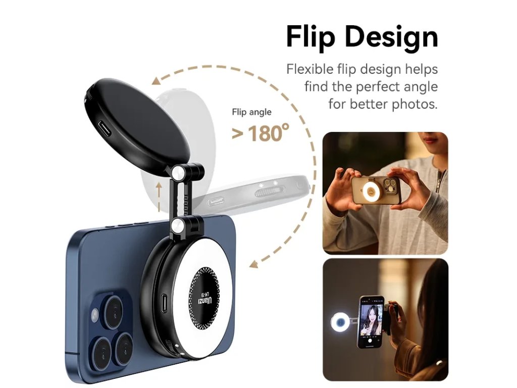 Selfie kruhové světlo Ulanzi LM19 MagSafe LED je kompaktní, skládací osvětlení určené pro tvůrce na cestách. Díky kompatibilitě s MagSafe a flexibilnímu designu s možností otočení o 180° se snadno připojuje k telefonu nebo kovovým povrchům pro fotografování bez použití rukou. Vychutnejte si jemné, lichotivé světlo s nastavitelnou teplotou barev (2500K – 8500K) a plynulým stmíváním pro bezvadné selfie, vlogové a videohovory. Lehké, ale výkonné, slouží i jako stojan na telefon a nabíjí se přes USB-C - ideální na cesty, živé vysílání a každodenní tvorbu obsahu.