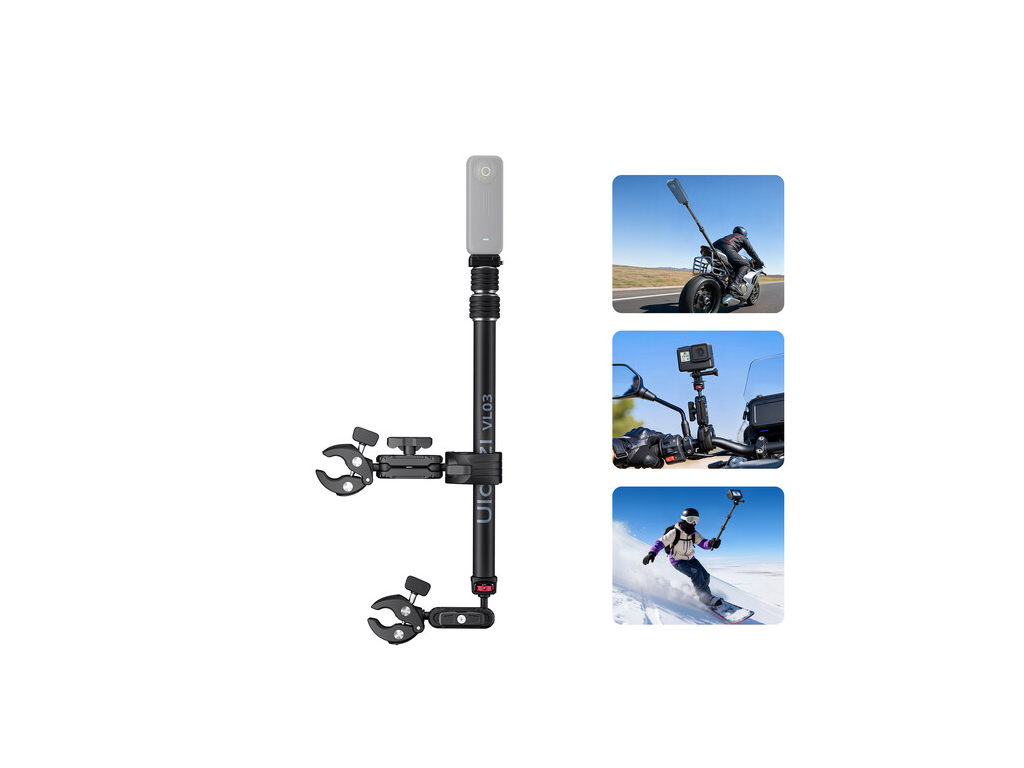 Neviditelný držák na selfie tyče pro motocykly Ulanzi VL03 je robustní a stabilní montážní systém určený k zachytávání plynulých filmových záběrů během jízdy vysokou rychlostí. Díky vylepšenému systému dvojitých svorek, 1/4" svorce s čelistí a super svorce s kulovou hlavou zajišťuje pevnou stabilitu pro motocykly, akční sporty a outdoorová dobrodružství. Je kompatibilní s akčními kamerami a selfie tyčemi a poskytuje odolnost vůči vibracím.